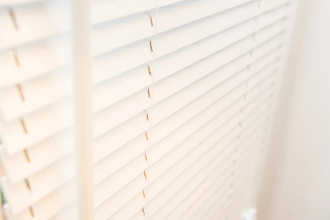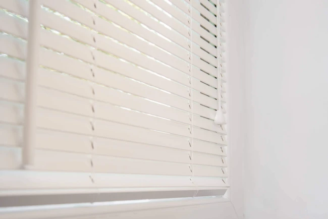 Странично напречно сечение на 25 mm инвазивна дървена щора в стъкления прозорец.