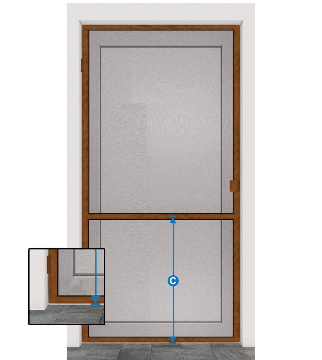 Когато изчислявате височината на напречната греда, обърнете внимание дали балконската врата, на която ще се монтира комарникът, има такава напречна греда. Ако е така, височината "C" се измерва от дъното на мрежата против комари до средата на напречната греда. Ако нямат такава, препоръчително е височината на напречната греда да бъде половината от височината на "B".