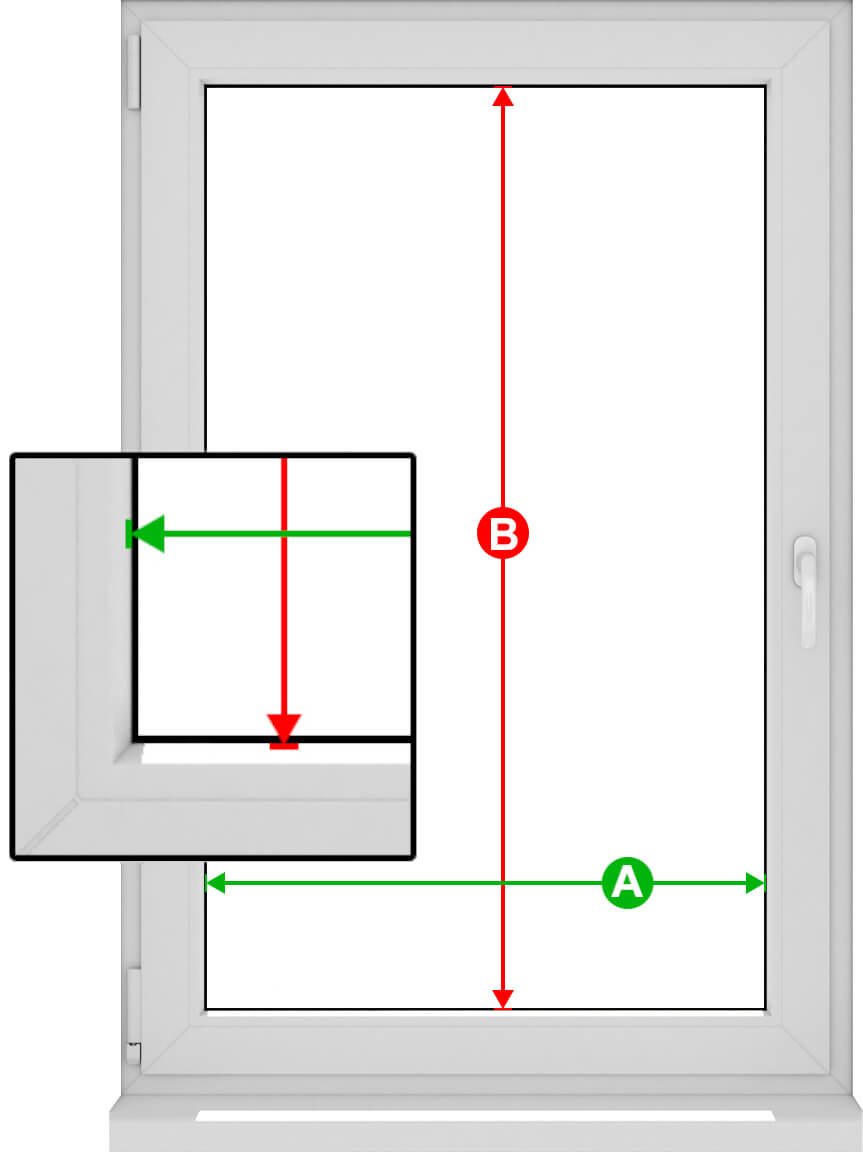 Височината на щорите "B" е - общата височина на крилото на прозореца минус 2 см.