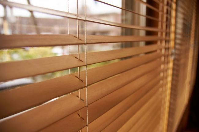 Странично напречно сечение на 25 mm инвазивна дървена щора в стъкления прозорец.