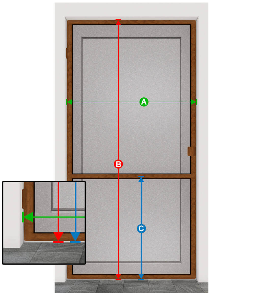 Когато изчислявате височината на напречната греда, обърнете внимание дали балконската врата, на която ще се монтира комарникът, има такава напречна греда. Ако е така, височината "C" се измерва от дъното на мрежата против комари до средата на напречната греда. Ако нямат такава, препоръчително е височината на напречната греда да бъде половината от височината на "B".